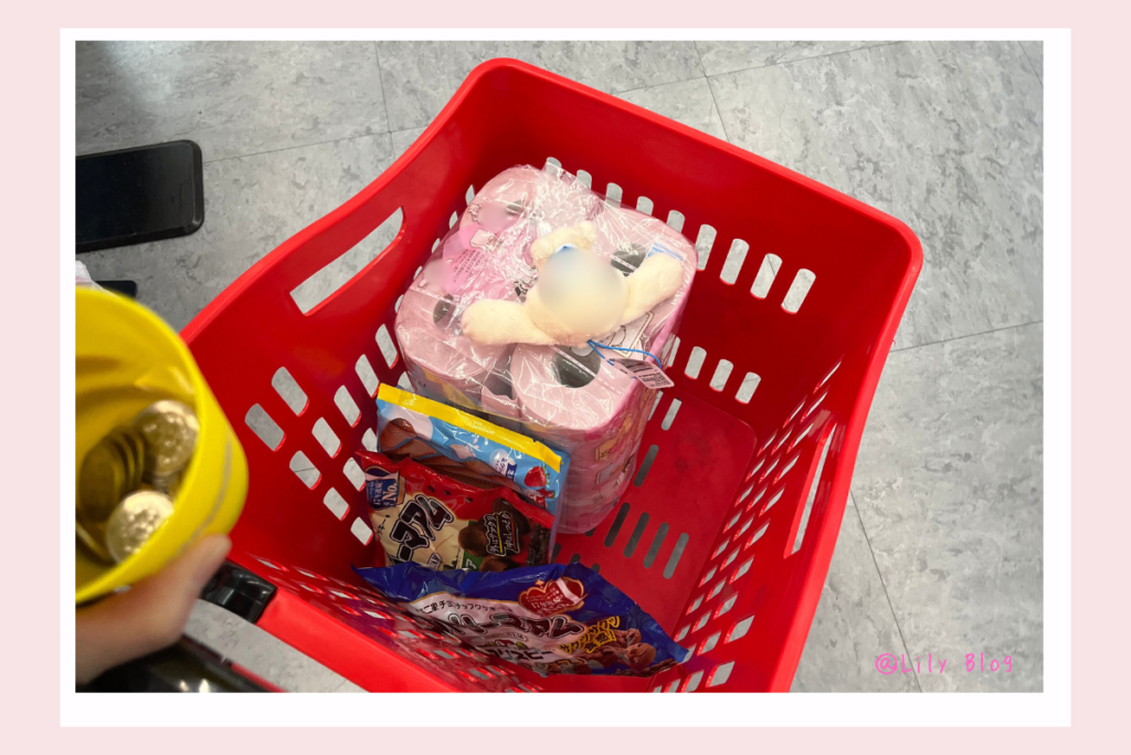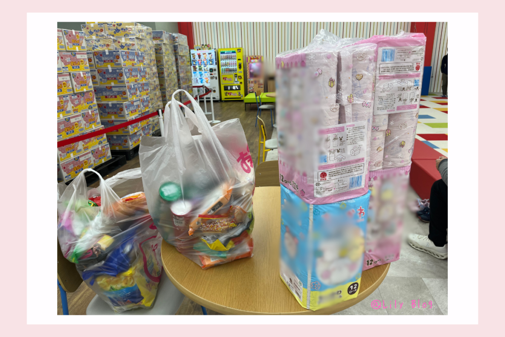 取れた景品はカートで運び、帰る時には袋に入れて行きます。