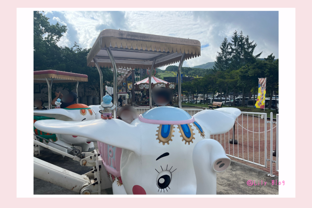 ゾウのポタくんに乗って空を飛ぶアトラクションで、小さい子でも楽しんでいました。